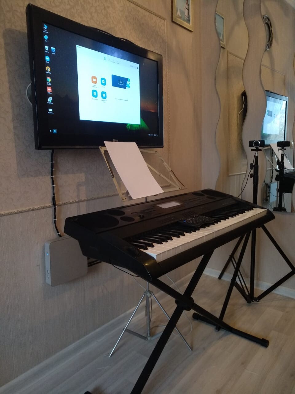 Еще у меня 2 камеры и система фортепиано на расстоянии.⠀Онлайн-занятие требует особой сосредоточенности. Я все время слежу за композицией в кадре — как и где я расположена, какой за мной фон. Слежу, насколько быстро переключаюсь между нотами, демонстрацией роликов и своим экраном.