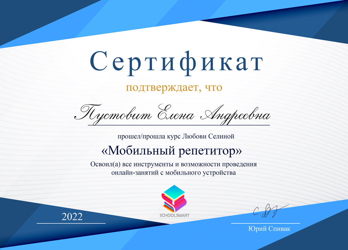 Любовь виртуозно умеет пользоваться мобильными устройствами для проведения уроков и готова поделиться с вами своими секретами и фишками на курсе «Мобильный репетитор»